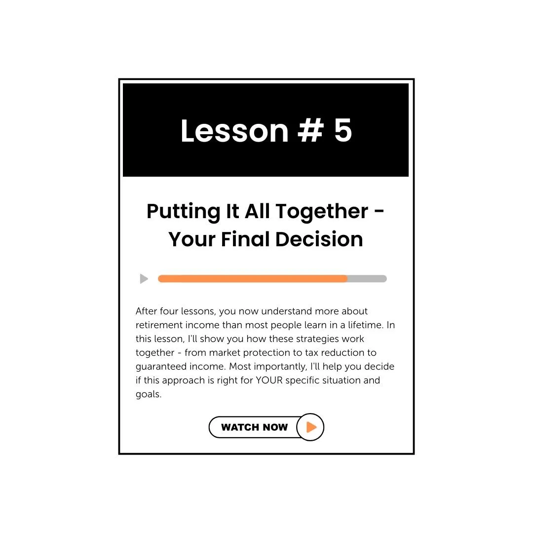 Intro: After four lessons, you now understand more about retirement income than most people learn in a lifetime. In this lesson, I'll show you how these strategies work together - from market protection to tax reduction to guaranteed income. Most importantly, I'll help you decide if this approach is right for YOUR specific situation and goals.