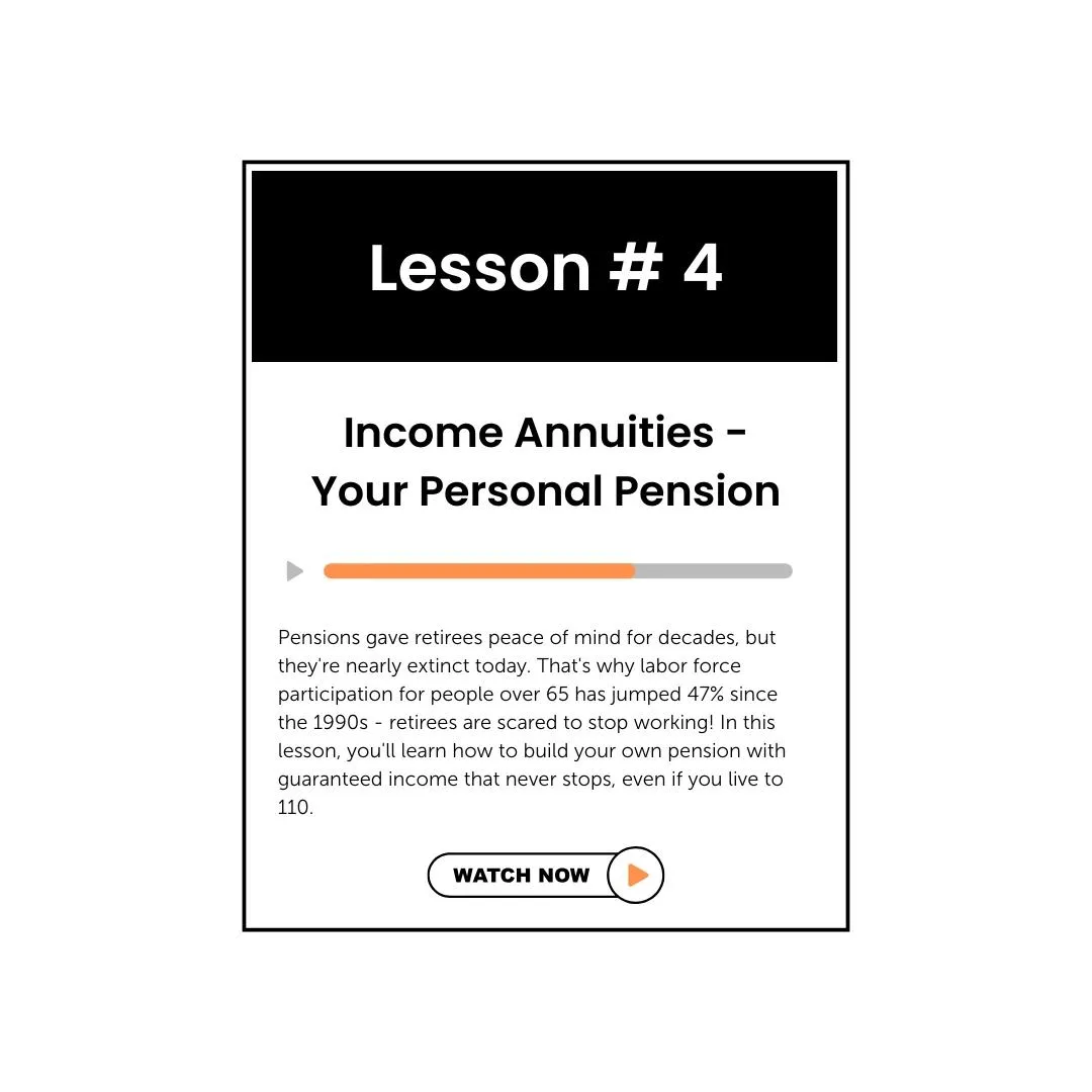 Pensions gave retirees peace of mind for decades, but they're nearly extinct today. That's why labor force participation for people over 65 has jumped 47% since the 1990s - retirees are scared to stop working! In this lesson, you'll learn how to build your own pension with guaranteed income that never stops, even if you live to 110.