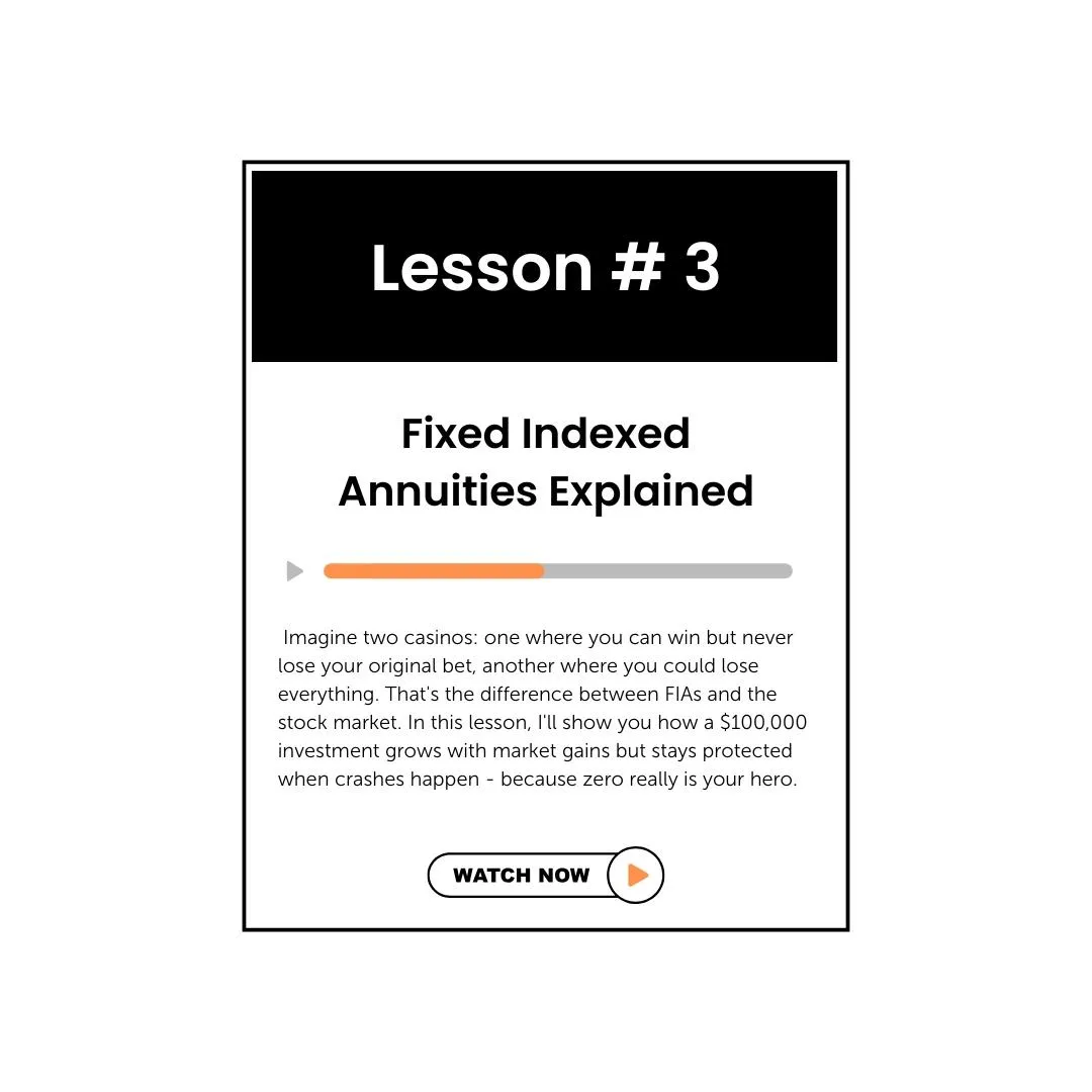 Imagine two casinos: one where you can win but never lose your original bet, another where you could lose everything. That's the difference between FIAs and the stock market. In this lesson, I'll show you how a $100,000 investment grows with market gains but stays protected when crashes happen - because zero really is your hero.