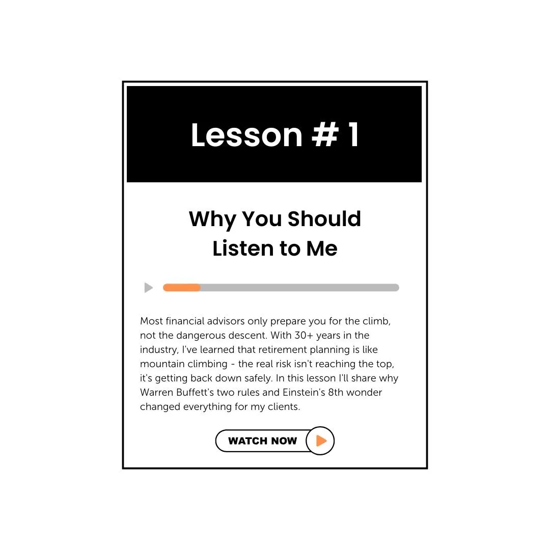 Most financial advisors only prepare you for the climb, not the dangerous descent. With 30+ years in the industry, I've learned that retirement planning is like mountain climbing - the real risk isn't reaching the top, it's getting back down safely. In this lesson I'll share why Warren Buffett's two rules and Einstein's 8th wonder changed everything for my clients.